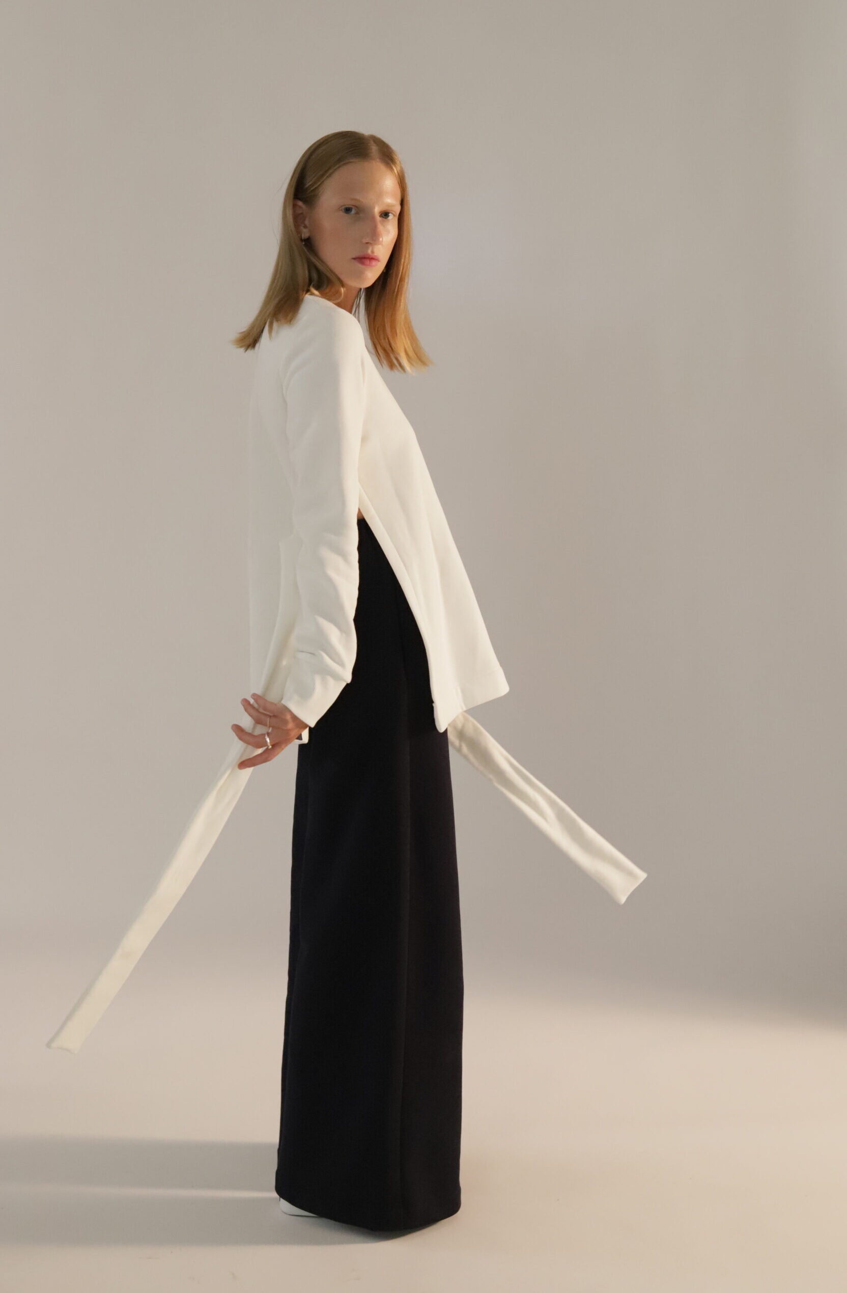 Maglia in Soffice Felpa Organica caratterizzata da profondi spacchi laterali e lunghi lacci avvolgenti, questo capo è versatile e originale. I lacci possono essere utilizzati per segnare il punto vita o semplicemente per aggiungere carattere al look.